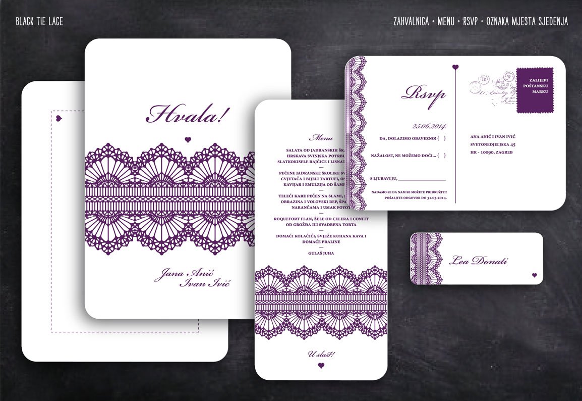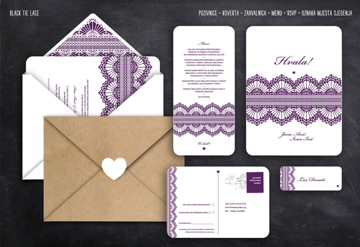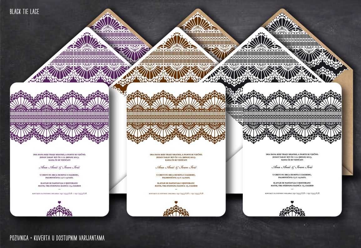 Elegantna i sofisticirana pozivnica za formalnije zabave ili vjenčanja sa uzorkom čipke u tri prekrasne boje - ljubičasta, smeđa i crna...