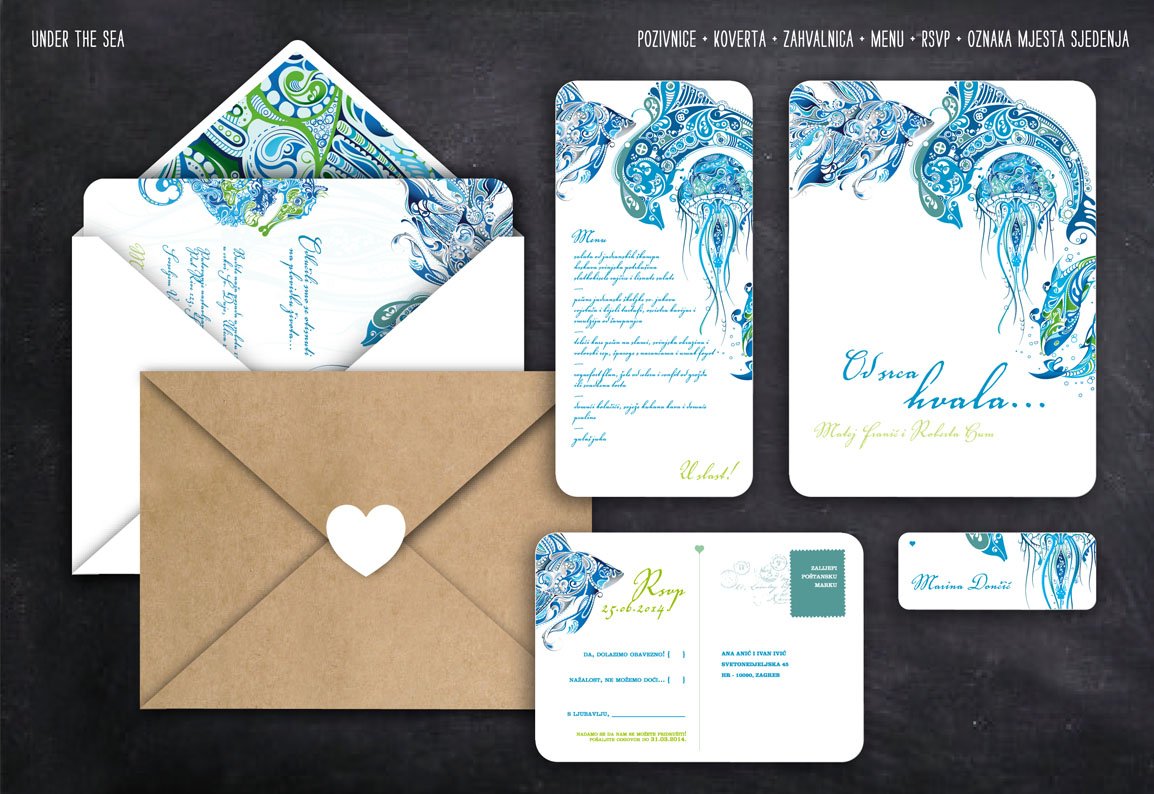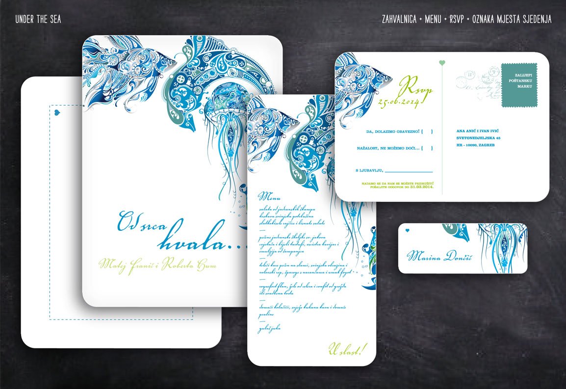 Prekrasne ilustracije morske flore i faune u plavim, tirkiznim i zelenim tonovima.... jednostavno savršena pozivnica za ljetne zabave ili vjenčanja uz more.